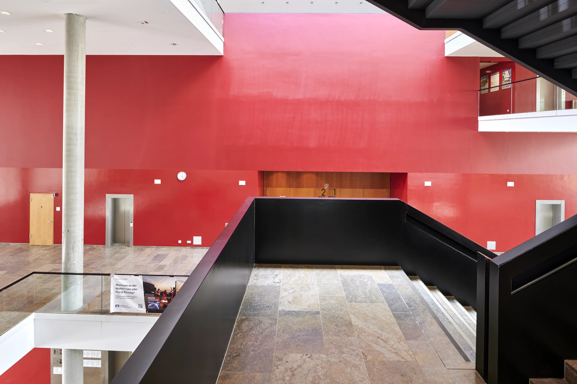 Ein zentrales Element der Raumgestaltung ist die direkte Sichtbeziehungen zur Campusanlage, die durch große Fensterfronten eröffnet werden. Ein weiteres besonderes Merkmal ist die Möglichkeit, die Hörsäle 1 und 2 durch eine bewegliche Trennwand zu einem großen Hörsaal zu vereinen. Der durch die Vereinigung entstehende Hörsaal bietet Platz für bis zu 1228 Studierende. Angeordnet sind die Hörsäle in den Randbereichen und können durch das große zentrale Treppenhaus erreicht werden. Im Erdgeschoss befinden sich ein Café und Schließfächer. Das große Foyer ist Veranstaltungsort für verschiedene Events und Campus Messen. Die folgenden Architekturfotografien spiegeln die Details des Entwurfs wieder.