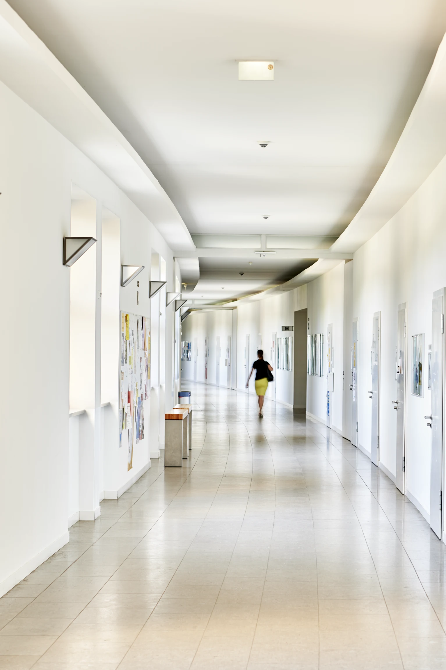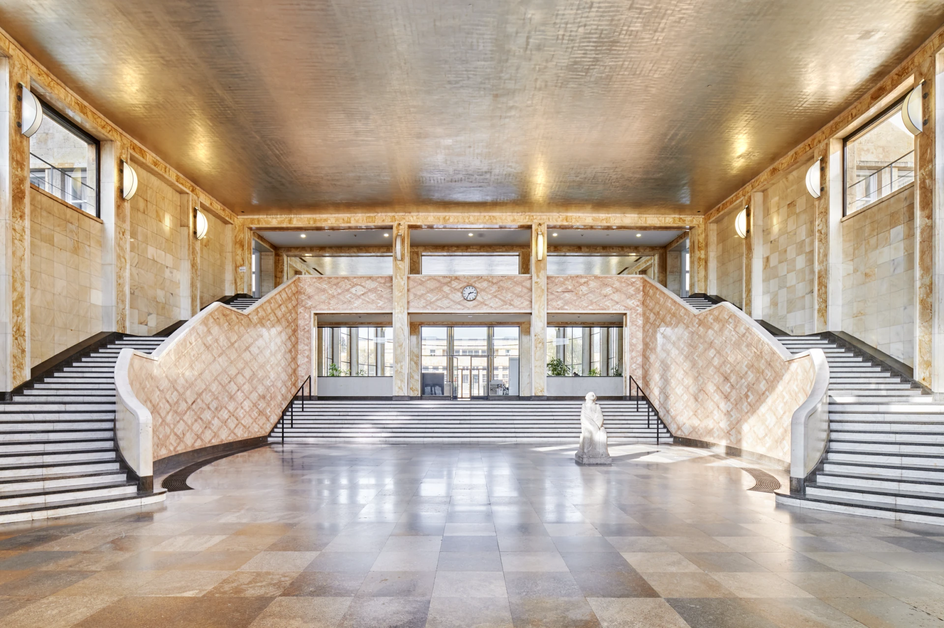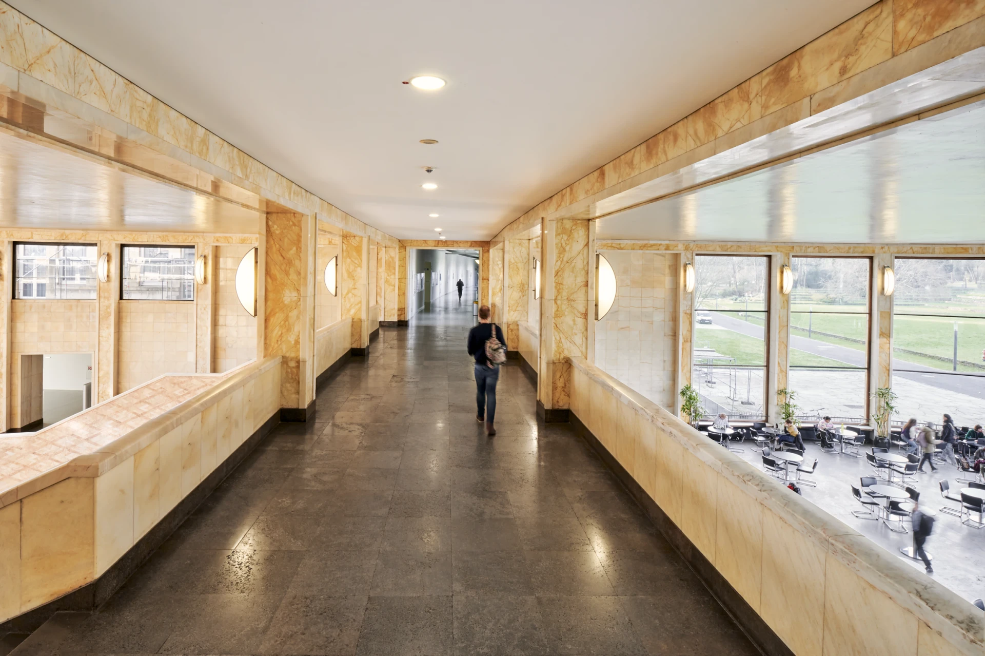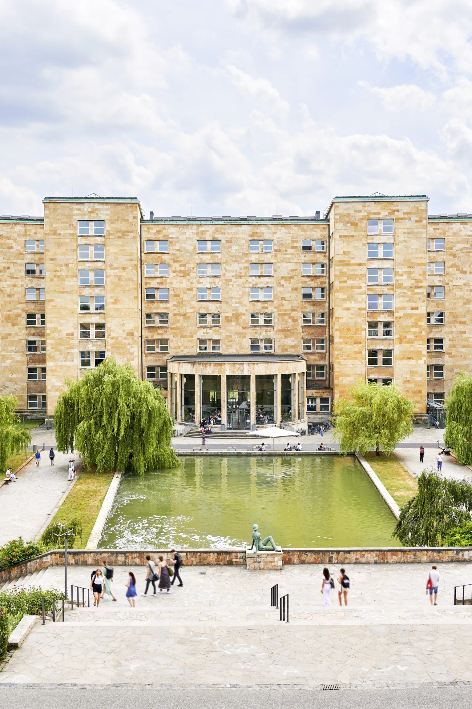 Das Gebäude fällt besonders durch die gerundete Form seines Baukörpers und der Fassade aus Travertin auf. Ein besonderes Highlight ist der Rundpavillon auf der Rückseite des Gebäudes. Er greift die Form des halbrunden Foyers mit beidseitigem Treppenaufgang auf und eröffnet durch die Glasfassade den Blick auf die Parkanlage mit nachgelagertem Casino. In der großen Halle befindet sich ein Café des Studierendenwerks. In den äußeren Flügeln des Gebäudes sind die Räume der geisteswissenschaftlichen Bibliothek angesiedelt. Die nachfolgenden Architekturfotografien geben einen Einblick in die Impotenz des Gebäudes.