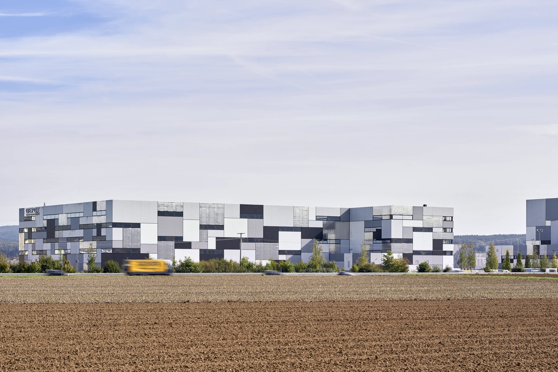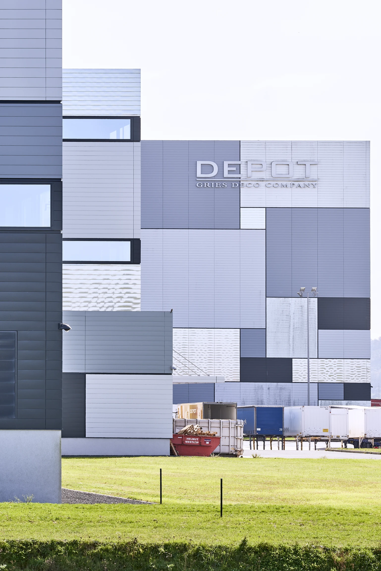 The multi-faceted design of the façade, consisting of metal sheets in different shades of gray, black and white and formats, is particularly striking. The idea of the interlaced elements picks up on the internal function of storing stacked parcels and carries it to the outside. Some elements are made of bright stainless steel, reflecting the surrounding landscape from different angles. In this way, a connection is created between the building structure and the surrounding landscape, incorporating the eye-catching building. By guiding the façade pattern around the edges of the building, the three-dimensionality of the concept is reinforced. The eye-catching design of the façade interprets the functional cubic design of the building in a unique and modern way. Last but not least, it symbolizes the identity of the company through its decorative appearance. Although it stands out from the landscape and at the same time blends in with it in the reflections. This exciting concept by Netzwerkarchitekten impressively demonstrates how functional industrial buildings can become sculptural landmarks.