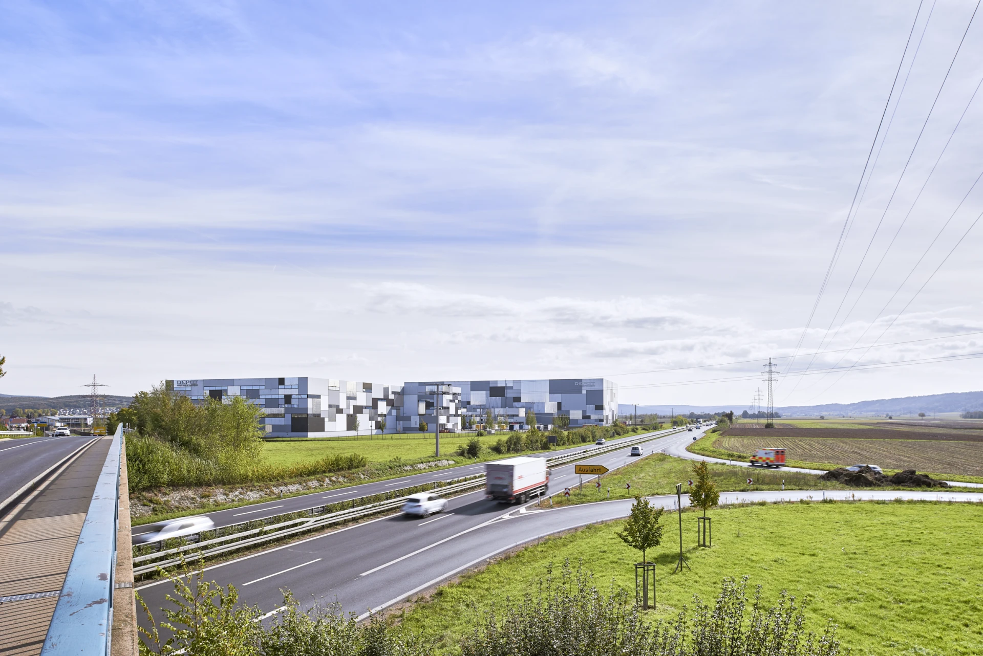 The Gries Deco Company is particularly well known for its stores under the name “DEPOT”. A new logistics center was built in Niedernberg, Upper Franconia, in order to handle the growing stocks of the expanding company. The new logistics center offers capacity for 117,500 pallet spaces arranged in a 40-meter high high-bay warehouse divided into 12 aisles. The impressive campus concept was designed by Darmstadt-based Netzwerkarchitekten and was completed in 2012. In line with the master plan, the design envisages two warehouses. One for a high-bay warehouse and one for order picking, as well as an administration building and parking garage. However, only the two warehouses were implemented initially. The alignment of the two halls is parallel to the B469 federal highway, from which the A3 freeway can be reached in 10 minutes. The strategic location of the site enables fast transportation routes as well as good north-south and east-west connections.