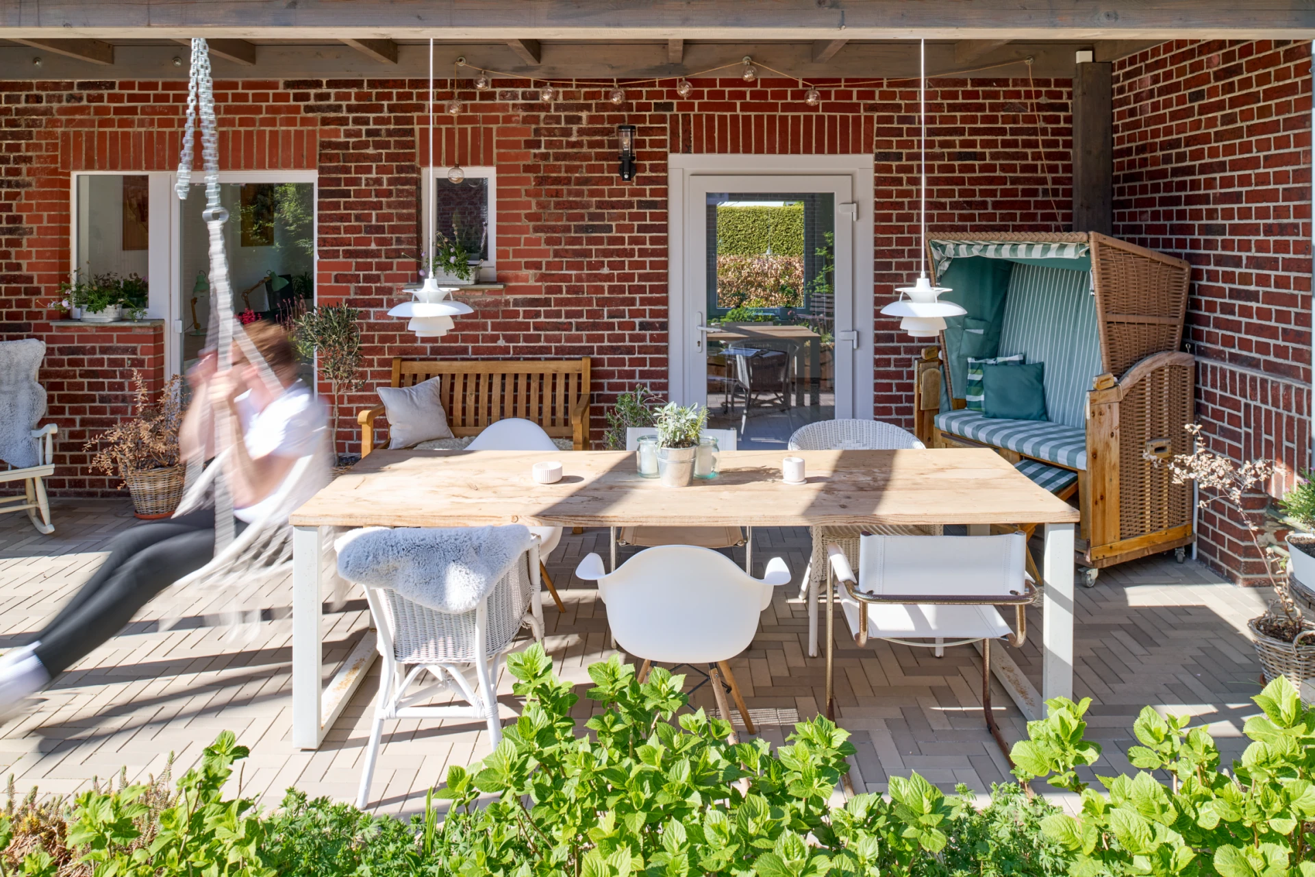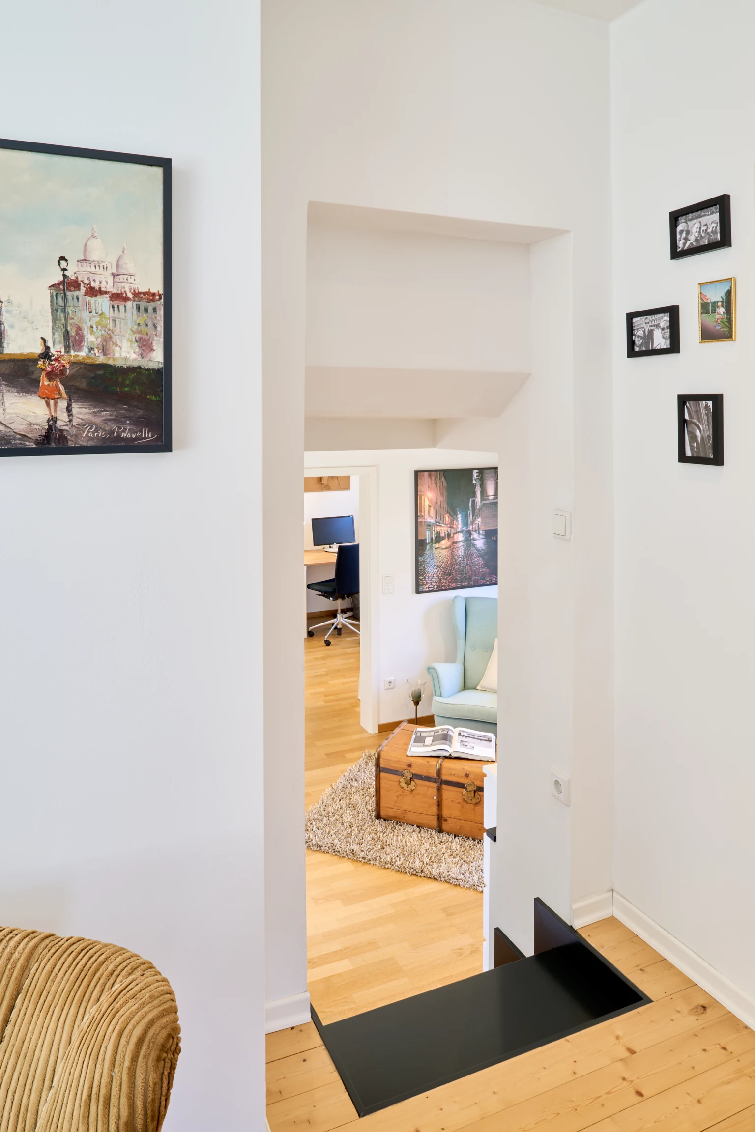 There is a quiet reading area, which also serves as a buffer between living and working due to its location. From here, you can access a green terrace in the inner courtyard, which further enhances the quality of living as a sheltered outdoor space. There is a separate apartment on the upper floor, the layout which reflects the concept. The converted, light-flooded top floor, which is accessed via an open-plan, white staircase, is particularly impressive. This not only leads vertically to the floor above, but also brings additional daylight into the rooms below. A roof terrace extends the living space into the open air and provides additional opportunities to relax. The project is an example of how new, contemporary living spaces can be created through the creative use of existing buildings without the need for a completely new building.