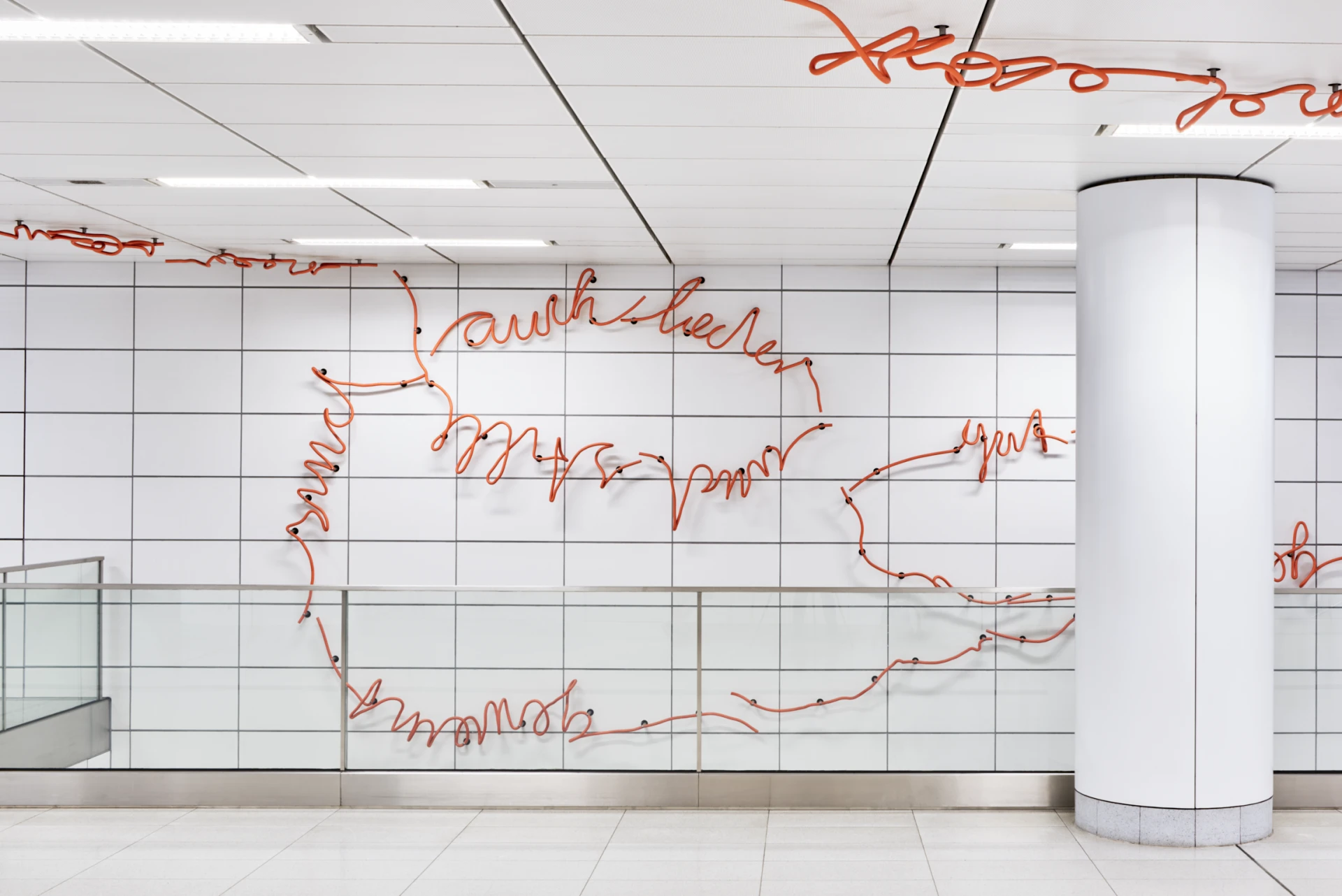 The open architecture allows the orange sculptural lettering elements to unfold and offers the opportunity to view them from all points in the room. At the same time, daylight reaches the tracks and opens up the underground station space to the city. The following architectural photographs illustrate the conceptual interaction of art and architecture and show the uniqueness of the Düsseldorf Wehrhan line.