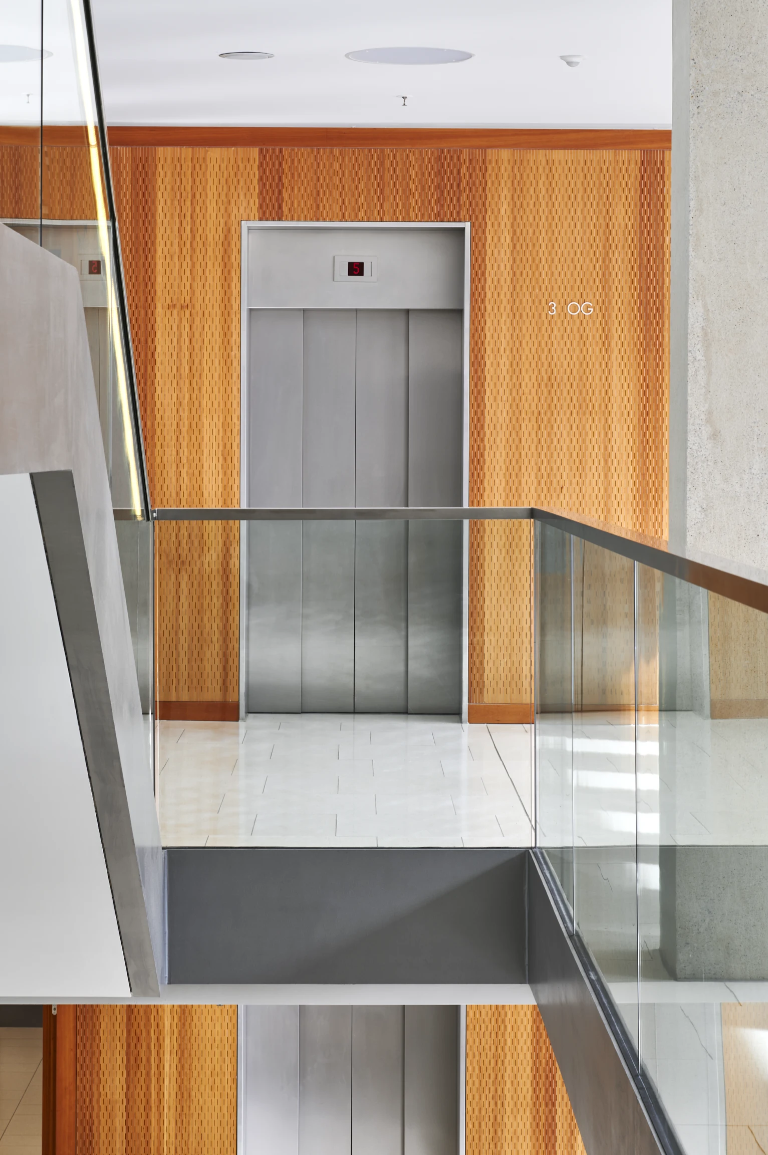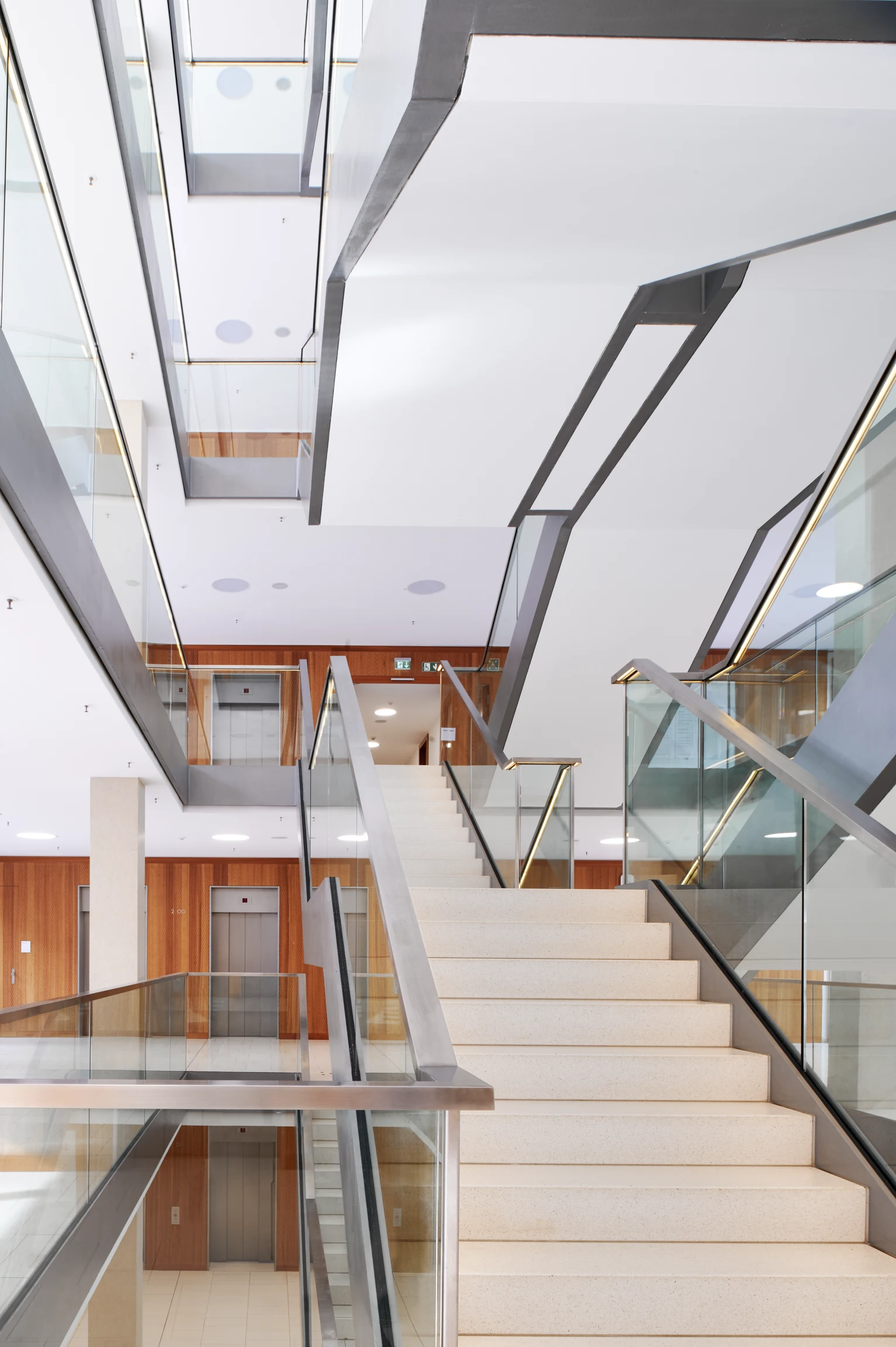 Access to the specialist library is on the first floor. On the second floor there are seminar rooms, the student secretariat and an open staircase leading to the faculties. The library extends over the first floor and a basement. Thanks to floor-to-ceiling glass fronts across both levels, the reading rooms are supplied with daylight from atriums, which ensures a pleasant learning atmosphere. A special feature of the building is the historic "ice cellar", which was uncovered during the construction work and is located in the middle of the library. A comprehensive insight in the design of Müller + Reimann Architects is provided by the following architectural photographs.