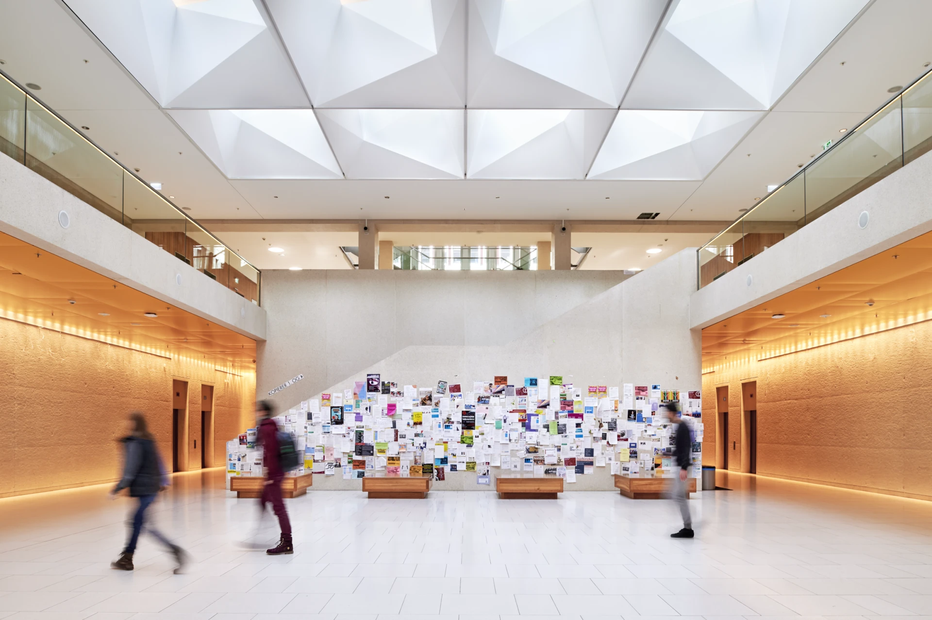 The PEG building is located on the eastern edge of the campus on Hansaallee between the Presidium of the Goethe University Frankfurt and the Seminarhaus. In addition to the specialist library on the first floor and basement, the "DASEIN" canteen and the faculties of Psychology, Education and Social Sciences, the building also houses the Student Secretariat and the Student Service Point. Upon entering the building, you first enter a generously designed hallway from which the canteen and the Student Service Point are accessible. Beyond this is an open foyer, which is flooded with daylight through a large skylight.