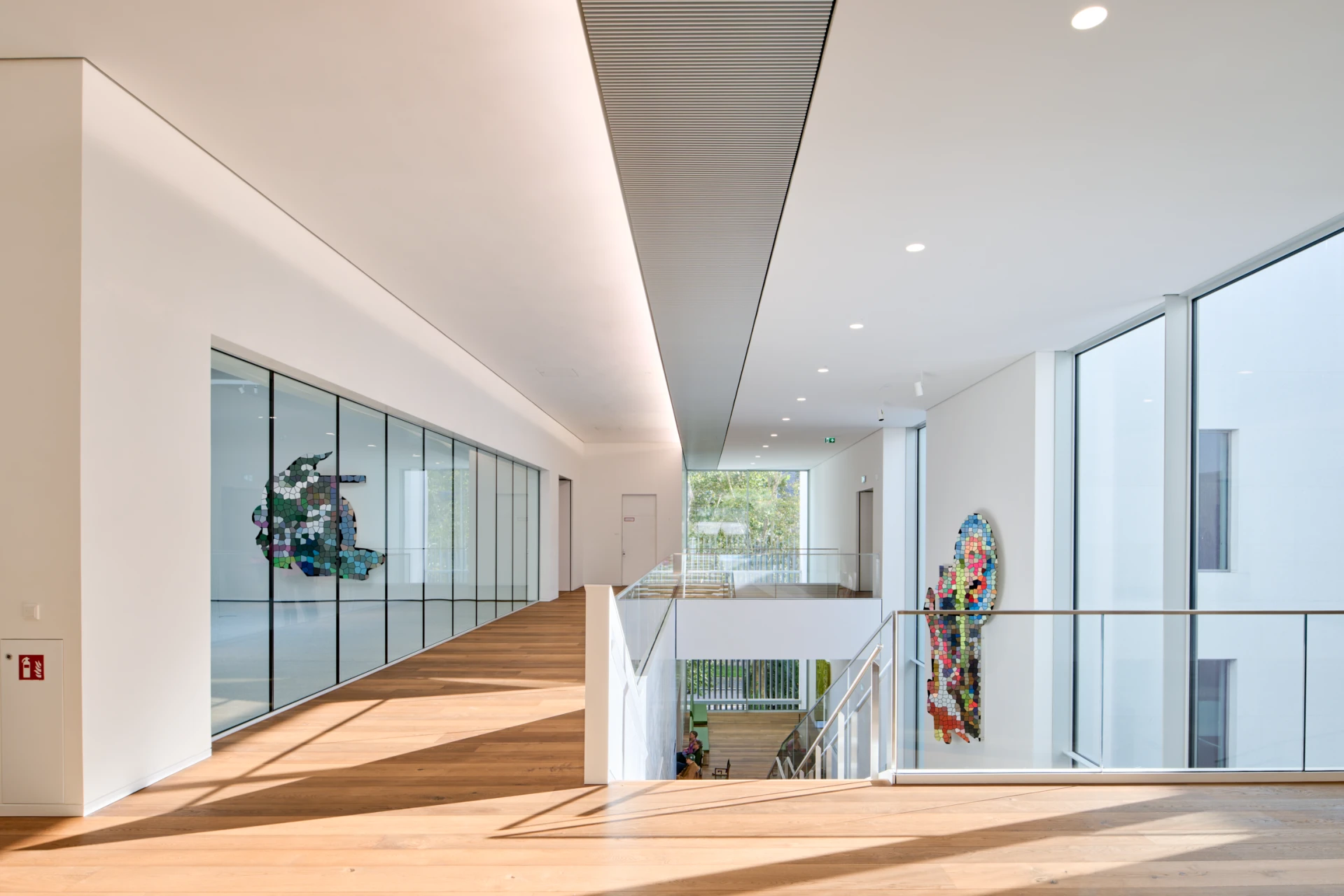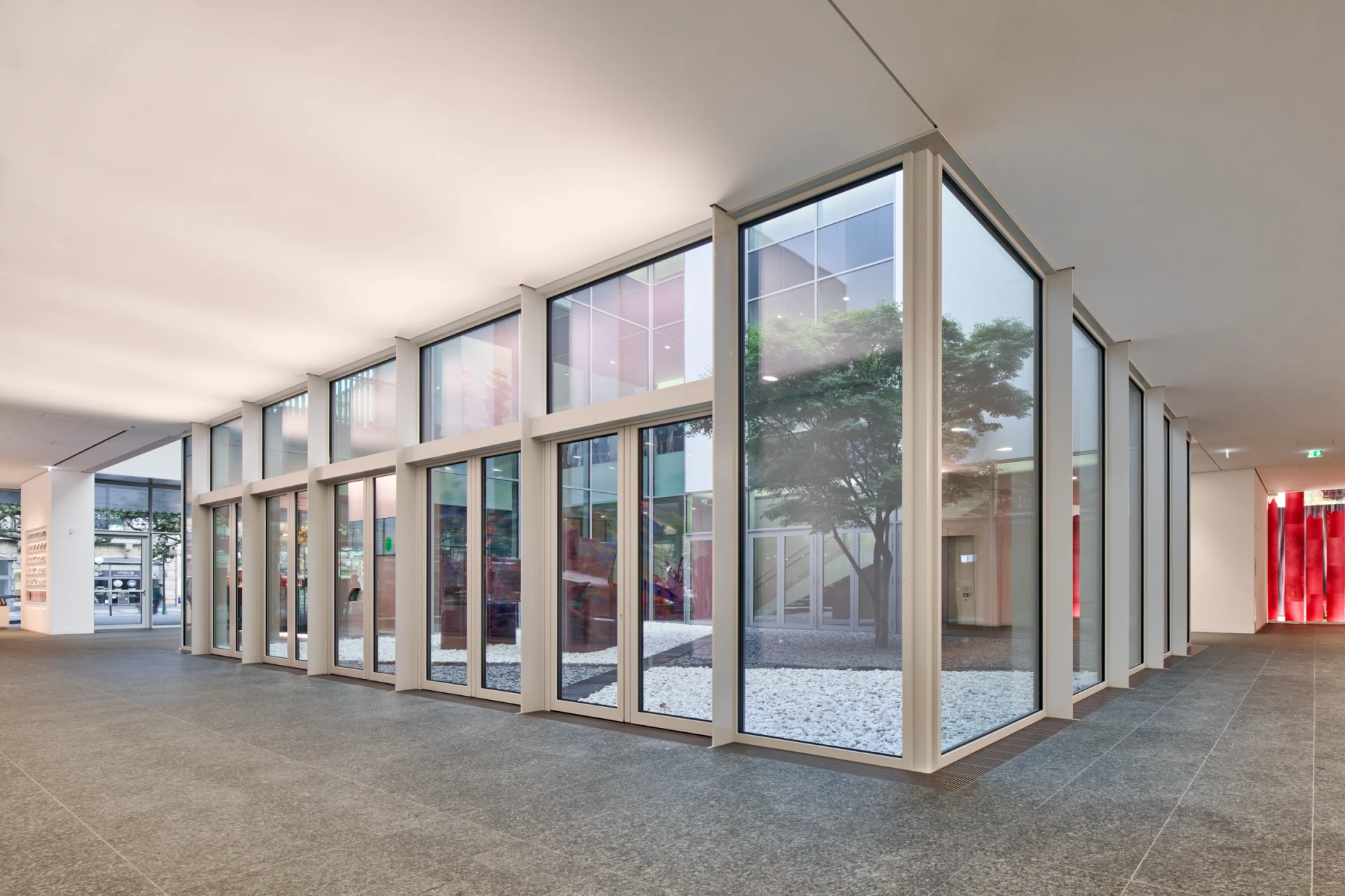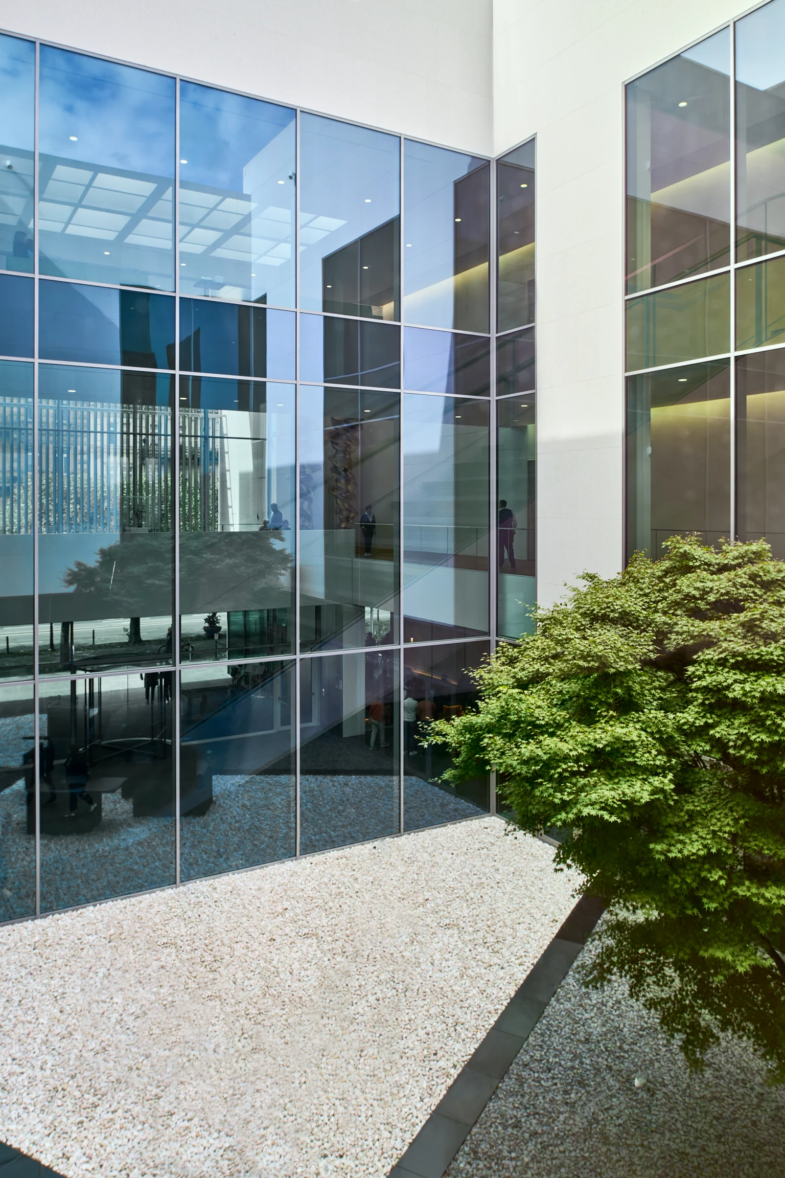 In traditional Japanese style, there is an inner courtyard in the center of the museum, which is home to a sculpture by Eduardo Chillida and a 60-year-old fan maple tree. Generous window fronts up to 6 meters high connect the building with the city outside. The volume of the building also deliberately takes up and continues the lines of the surrounding buildings. The structure of the museum is made up of 4 cuboids, which form the large exhibition rooms. The bright inner courtyard connects these rooms and is a constant point of reference for visitors. It also provides the rooms with daylight and makes the interior of the building appear open and transparent.