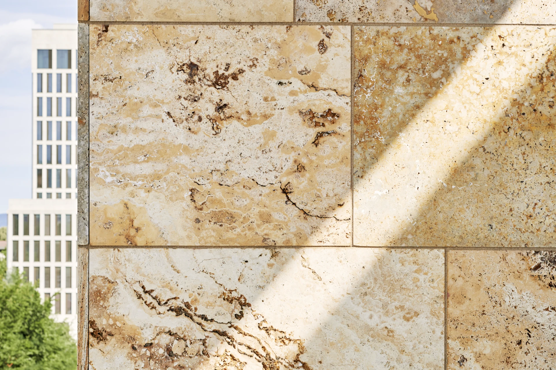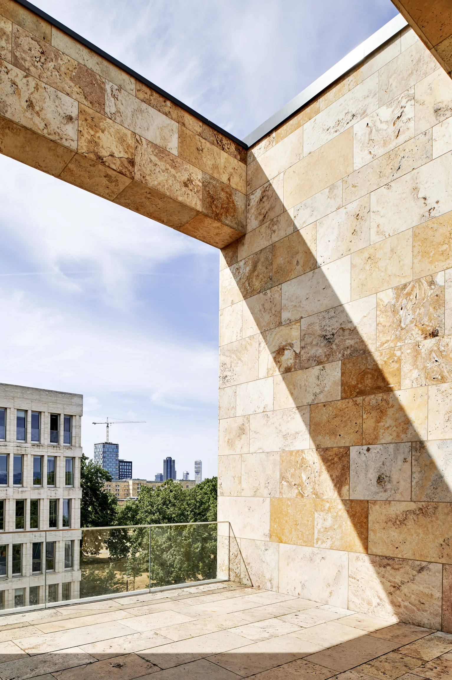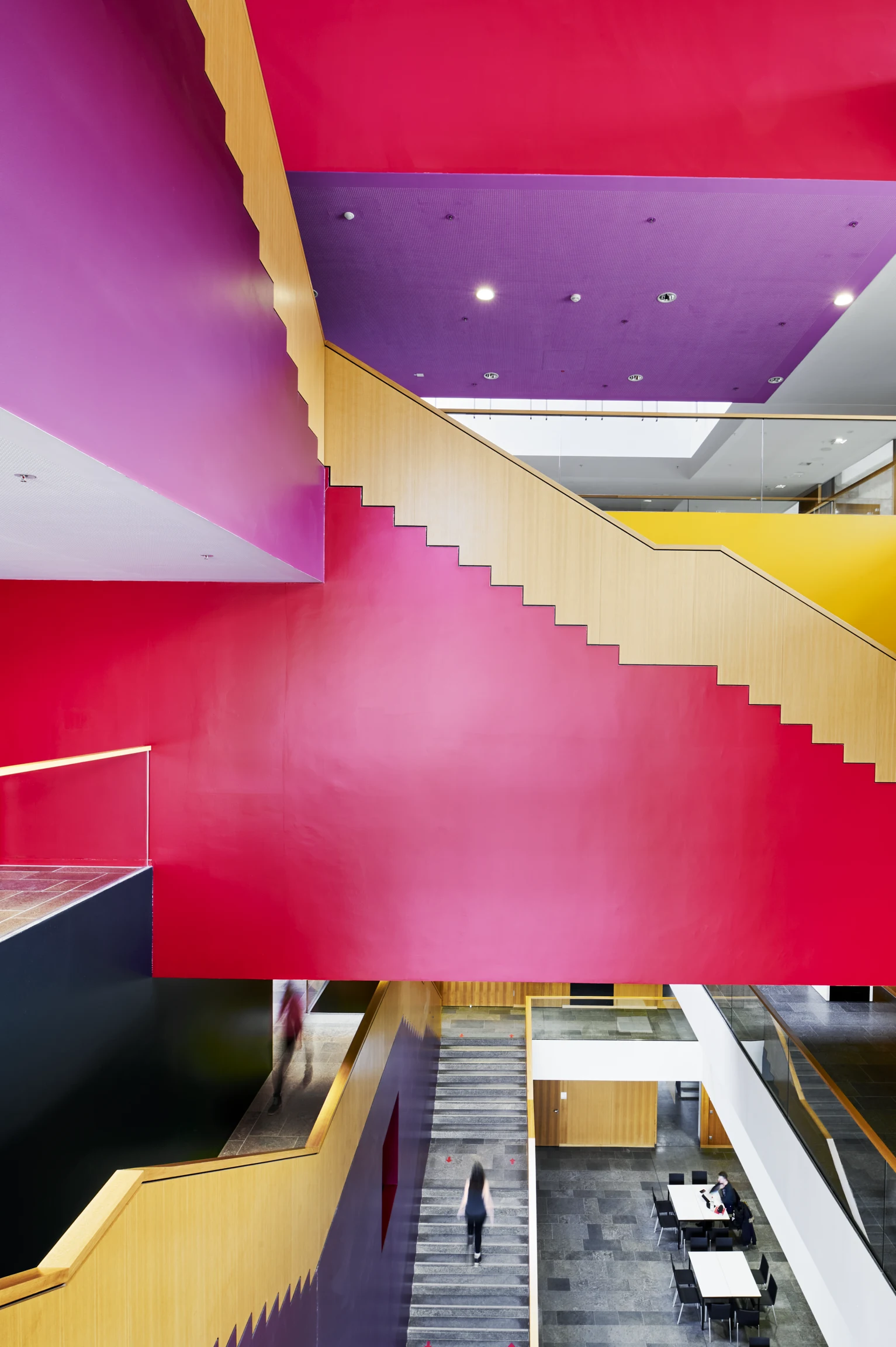 For seminar breaks, the design of the building offers three roof terraces that invite students to take a breath. The open design of the terraces, which extend over two floors and create a direct link to the campus of the Goethe University, is striking. The colorful design of the staircase in rich yellow, bordeaux, red and gall green can be interpreted as a homage to the university's namesake. The following architectural photographs illustrate the impressive design.